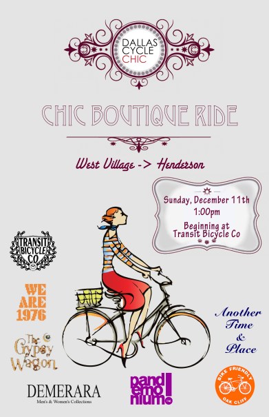 Join us tomorrow Sunday December 11th for the Dallas Cycle Chic holiday shopping tour by bike. Come for the holiday shopping, or take advantage of the excuse for a fun afternoon on your bicycle with friends.