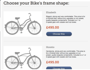 Through their website you can chose from the Elizabeth (women’s) or Horatio (men’s) model, then chose your color scheme – fenders, chain guard, handlebars, seat, and tires are all selectable – and number of gears, from the base price of £450 (~$770) with free shipping within the UK. I didn’t see where you can get the crazy cool print that matches your speckled pants though….