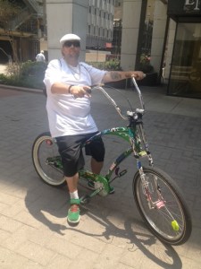 He was cruising up Akard to catch the train downtown yesterday when I chased him down for a photo. Flames come standard with this Rat Fink bike. He self- customized with his personal collection of stickers.