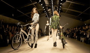 Yes, bikes were going down the runway with models. They weren’t being ridden necessarily (that was my first question too) but they had some pretty impressive color schemes on these classy little bikes.